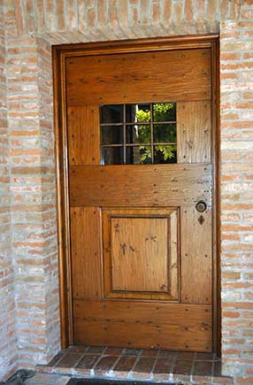 in legno di abete piallata a mano con chiodi ribattuti e inferriata antica nella parte superiore.